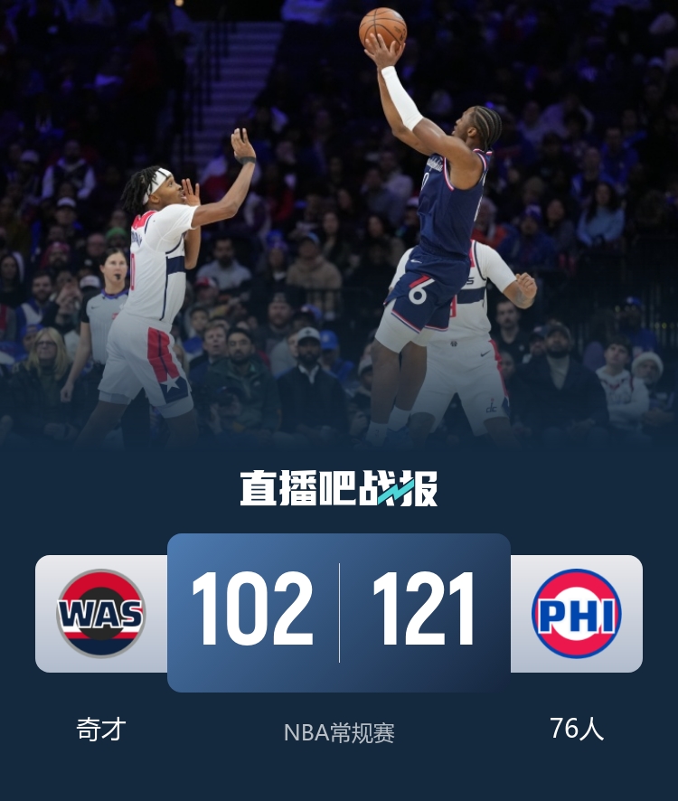 12月3日讯 NBA常规赛,76人主场迎战奇才。76人10胜9负东部第9,奇才3胜16负东部垫底。