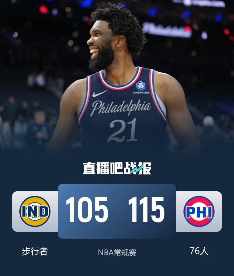 76人主场力克步行者 恩比德赛季新高39+9 乔治23+6+5
