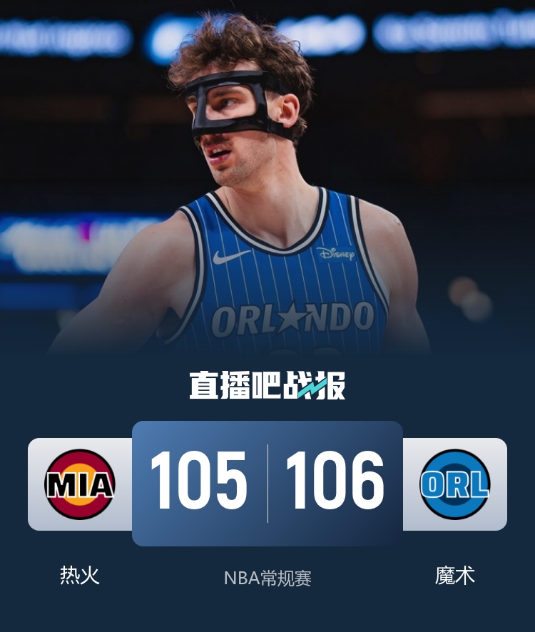 比赛开场,热火延续自己的快速进攻,双方陷入拉锯战,两队在对方禁区内都保持很高的命中率,首节结束魔术30-28领先。次节回来,阿德巴约和鲍威尔状态火热,撑起热火进攻,小瓦内突外投单节11分予以回应,半场结束热火60-57反超。易边再战,萨格斯手感滚烫外线连续投进单节砍下15分,热火则一度陷入得分荒全队仅得19分,魔术趁机反超并在三节结束时领先到8分。末节回来,贝恩进攻连续不中,本场手感冰凉,热火开始蚕食分差,但小瓦重新登场后还是稳扎稳打帮助魔术稳住场上形势,最后一分钟鲍威尔连续得分将分差缩小到1分,魔术连续不进,留给热火5.7秒最后一攻的机会,阿德巴约三分不中,比赛结束,魔术106-105险胜热火。